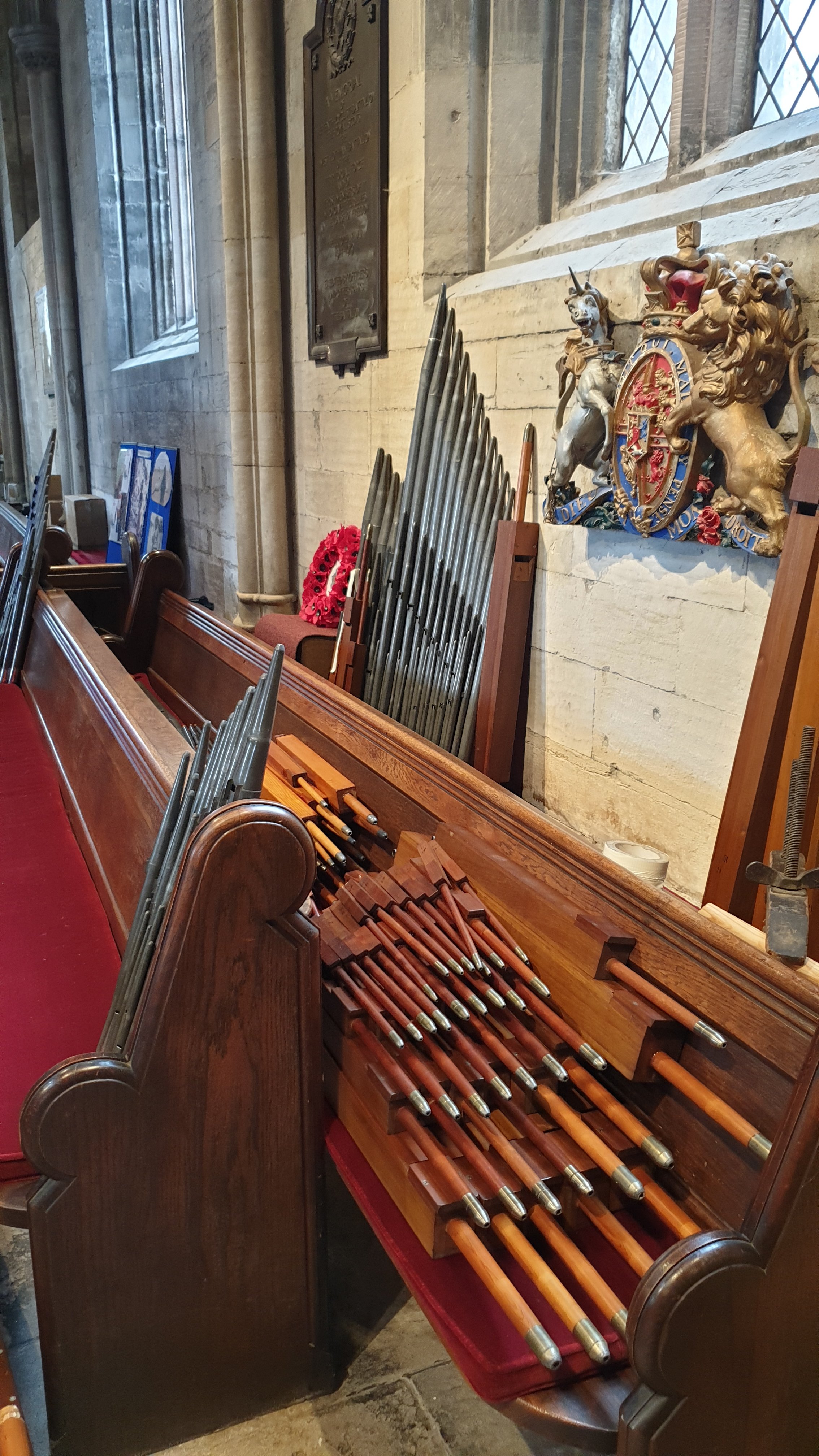 An interesting morning service with half the organ (the entire Great division) out of action as part of the cleaning works. Very impressed by how it stood up to a full church though, top marks for effort. Lots of piano too of course, always good fun however am not liking the new camera system showing quite how much hair the back of my head is lacking…